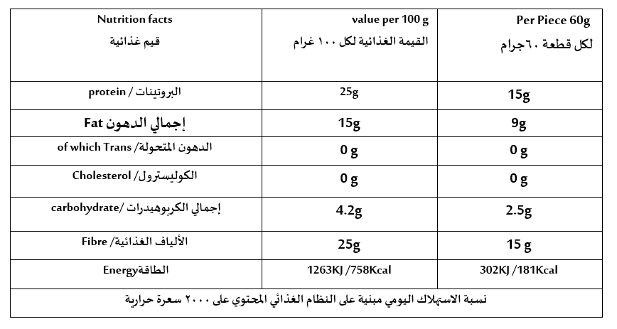المكونات : بروتينات الحليب (مركز بروتين مصل اللبن ، مركز بروتين الحليب) ، ألياف الذرة القابلة للذوبان في الماء ، حشو نكهة الكراميل المملح (قليل الفركتوز (الألياف الغذائية من الهندباء) ، الماء ، بروتين الحليب المعزول ، مسحوق الحليب منزوع الدسم ، زيت جوز الهند ، المرطب (الجلسرين) ، مثخن (صمغ الزانثان) ، نكهات طبيعية ، لون طبيعي ، مضاد للأكسدة (حمض الأسكوربيك) ، ملح ، محلي (سكرالوز)) ، شوكولاتة الحليب (ألياف الذرة القابلة للذوبان في الماء ، زبدة الكاكاو ، كتلة الكاكاو ، مسحوق حليب منزوع الدسم ، مستحلب (ليسيثين الصويا) ، نكهات طبيعية ، محلي (سكرالوز)) ، زيت جوز الهند ، ماء ، فول سوداني ، مرطب (الجلسرين) ، منتجات البيض (خليط البيض) ، ملح ، نكهات طبيعية ، منظمات الحموضة (بيكربونات الصوديوم (صودا الخبز) ، حامض الستريك) ، مستحلب (صويا) الليسيثين) ، مضادات الأكسدة (حمض الأسكوربيك) ، المُحلي (السكرالوز) ، المواد الحافظة (سوربات البوتاسيوم).منتج غني ببروتينات الحليب والألياف الغذائية.